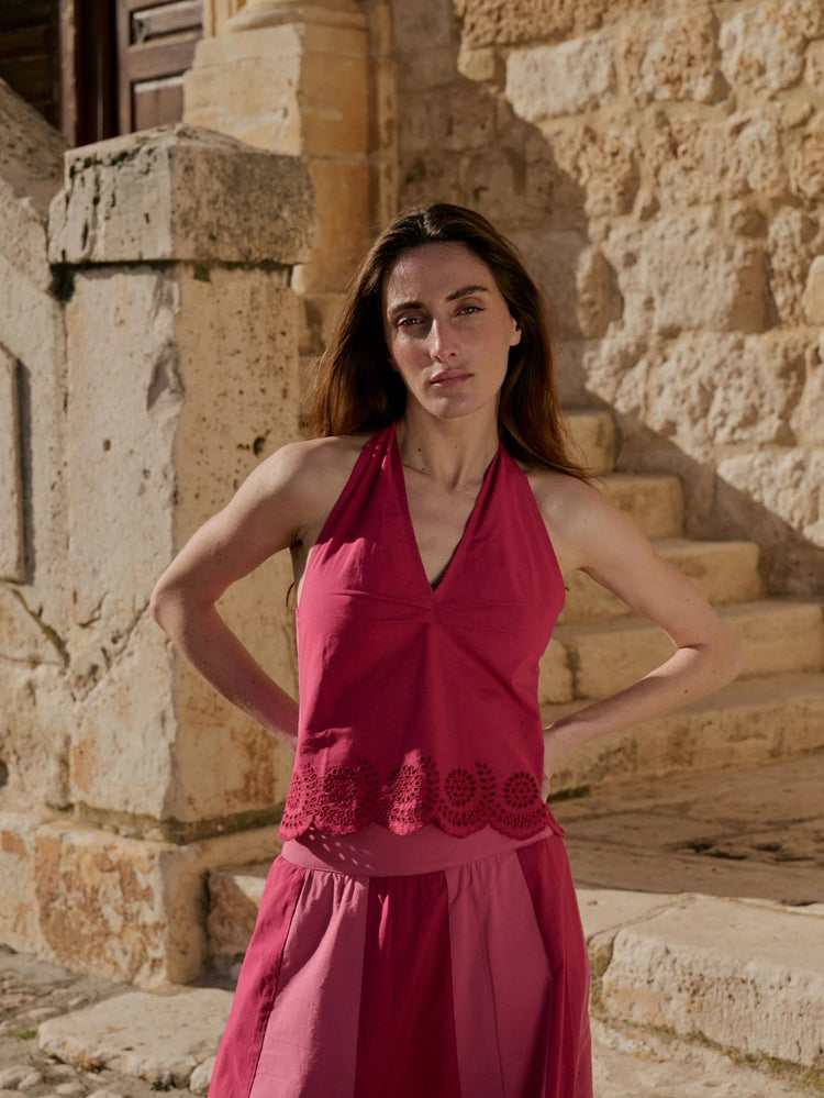 Hand-embroidered voluminous maxi skirt. Available in strawberry and beige tones. A flat top waistband cinches the waist with a side zipper. Gathering adds volume to the skirt, and front and back pleats run throughout the design. The pleat colors alternate between light and dark shades of strawberry and beige. Floral embroidery at the bottom of the skirt is done in the same thread tone as the fabric.
