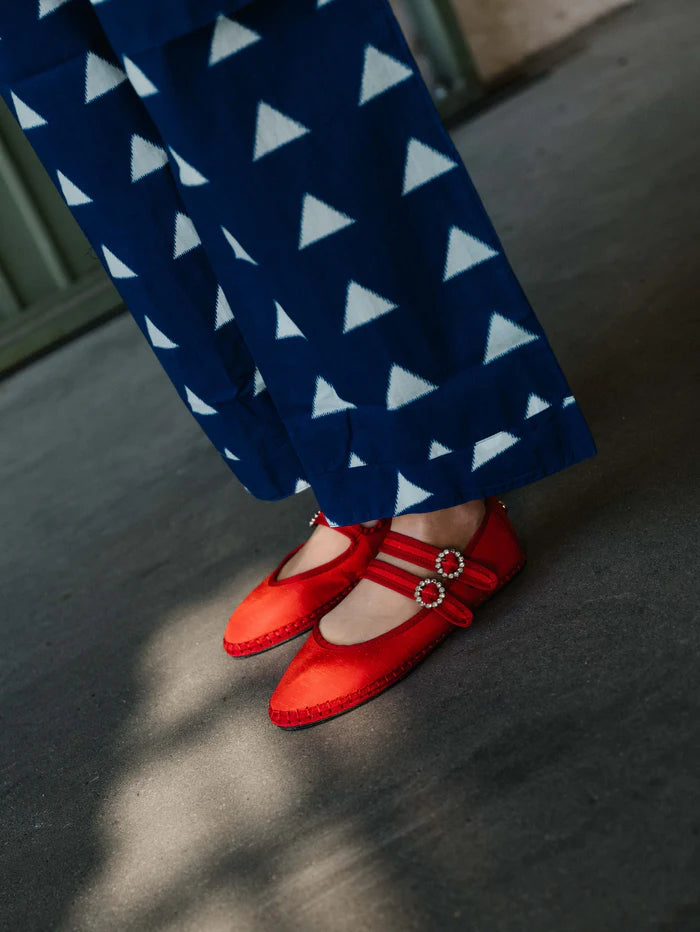 Las Double Lace Pepper, uno de los modelos más icónicos de Sveti Stefan, están confeccionadas con un tejido exterior compuesto 100% en satén en un tono rojo, a juego con el ribete también en color rojo. El diseño está fabricado íntegramente en España y creado de manera artesanal en los materiales de la más alta calidad. Es un modelo especial pensado para elevar cualquier conjunto que combina el satén con las icónicas hebillas joya.