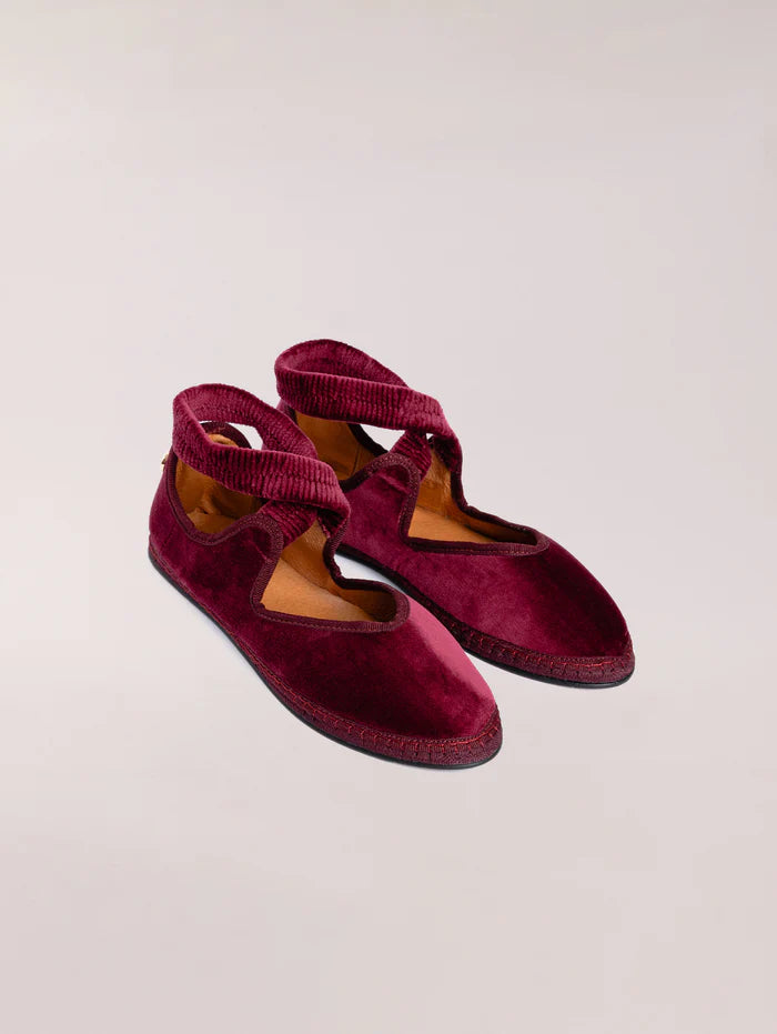 Bailarinas venecianas con cinta elástica cruzada en el tobillo. El zapato tiene en el exterior tejido de terciopelo y un interior de 100 % piel, junto con una plantilla de gel y una suela exterior de goma EVA, lo que lo convierte en un artículo de alta calidad y en un calzado muy cómodo. Además de contar con los mejores materiales, el zapato está completamente hecho y producido a mano en España.