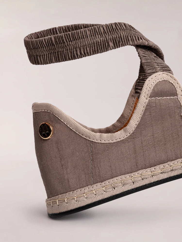 Bailarinas venecianas con cinta elástica cruzada en el tobillo. El zapato tiene en el exterior tejido 100 % raso salvaje y un interior de 100 % piel, junto con una plantilla de gel y una suela exterior de goma EVA, lo que lo convierte en un artículo de alta calidad y en un calzado muy cómodo. Además de contar con los mejores materiales, el zapato está completamente hecho y producido a mano en España.