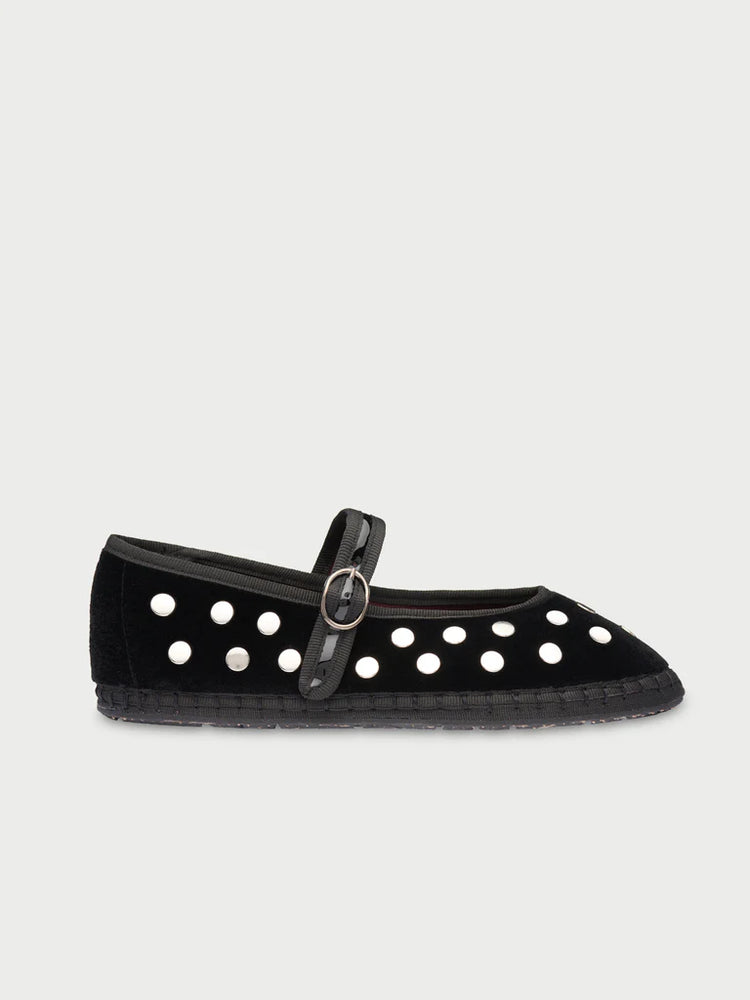 - Velvet ballerina v-hole in black with black piping and silver studs.