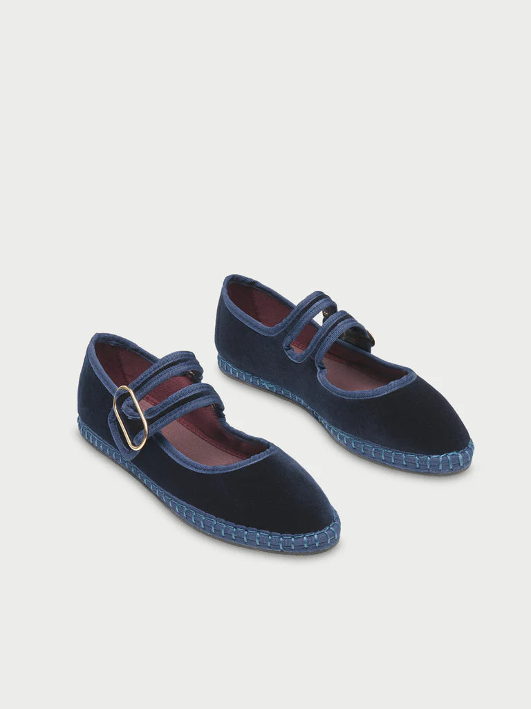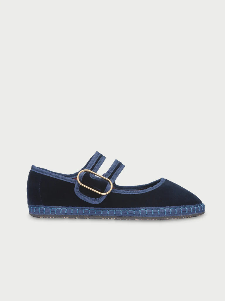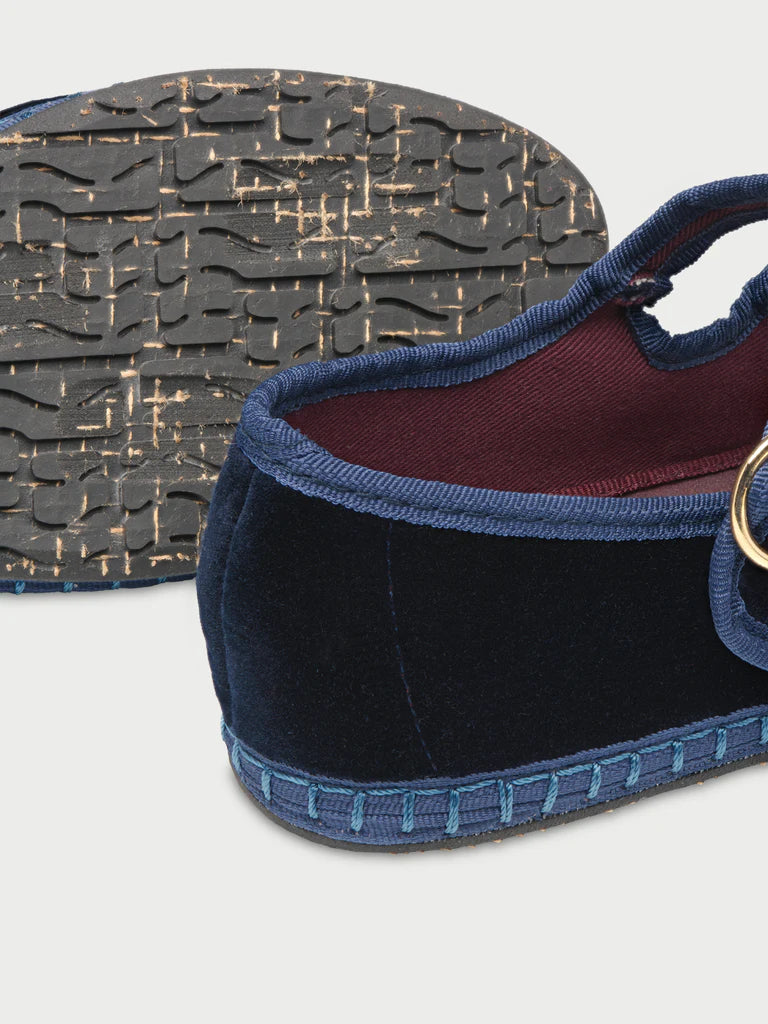 - Two strap velvet mary jane in dark blue with blue piping and a fake buckle.