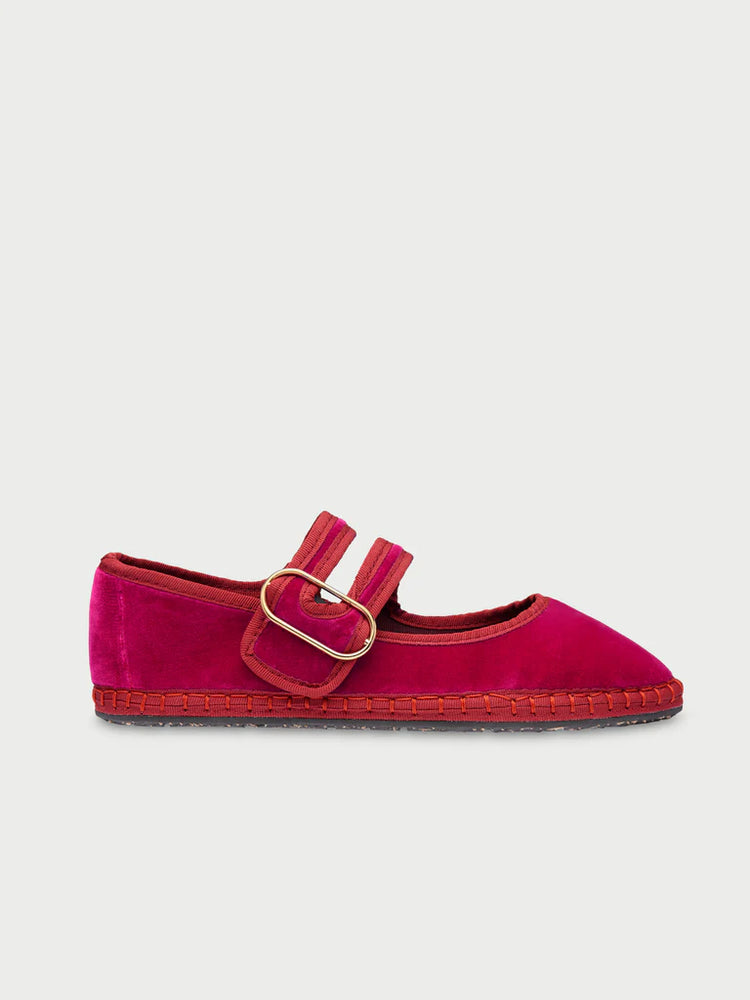 - Two strap velvet mary jane in fuchsia with orange piping and a fake buckle.